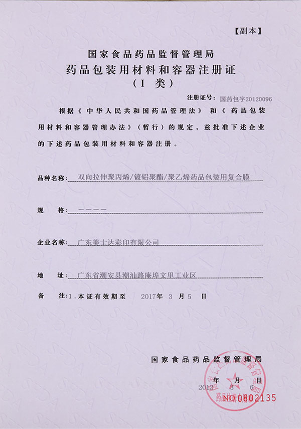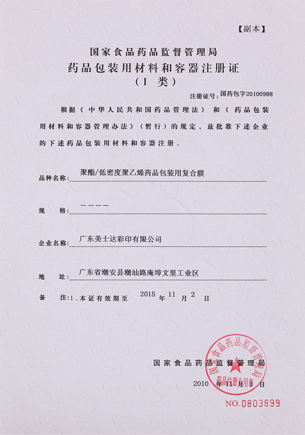 藥品包裝用材料和容器注冊(cè)證